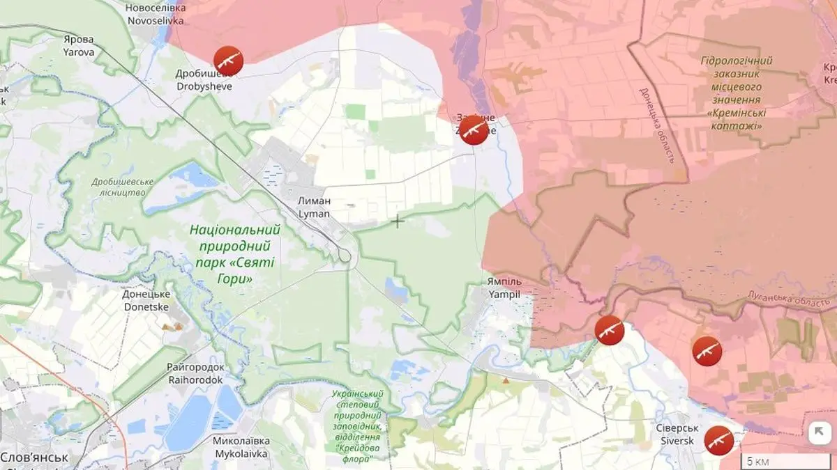 Параллельно россияне пытаются обойти Лиман с флангов, расширяя зону контроля и выискивая уязвимые участки в украинской обороне на линии Лиман-Северск. Например, они атакуют к югу от Лимана, в районе между этим городом и Ямполем, с продвижением в сторону Диброво и Старого Каравана. Там действует несколько боеспособных штурмовых отрядов россиян.