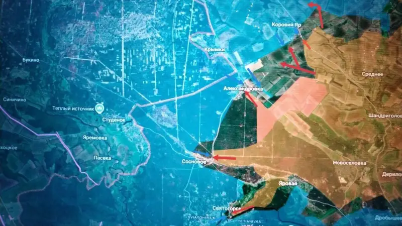 Сообщается, что штурмовые отряды 20-й гвардейской общевойсковой армии (20 гв. ОА, в/ч 89425) осуществили четырехкилометровый прорыв из района железнодорожной станции Яровая к восточным окраинам Святогорска через лесной массив возле болота Мартыненково. Кроме того, был взят под контроль трехкилометровый участок – пляж на берегу реки Северский Донец. Со стороны железнодорожной станции Сосновое идет северный охват Святогорска (обход с фланга), что говорит о начале формирования тактического кармана (будущего «котла») вокруг этого населенного пункта.
