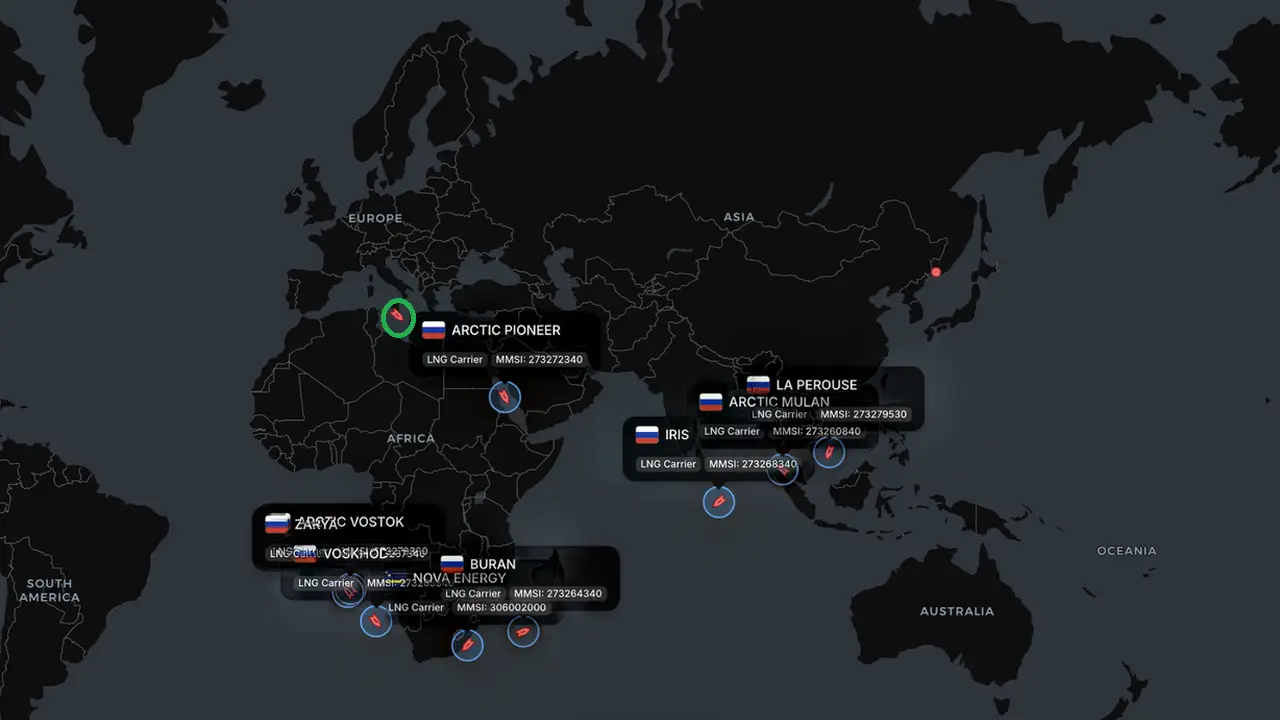 После атаки на российский СПГ-танкер Arctic Metagaz (обведен зеленым кружком на карте) в Средиземном море в начале марта, эта акватория фактически оказалась закрытой для газовозов из России. Во всяком случае, они сами избегают там появляться. Об этом сообщил аналитический портал Arctic Maritime Brief, ссылаясь на данные мониторингового портала MagicPort Maritime Intelligence.